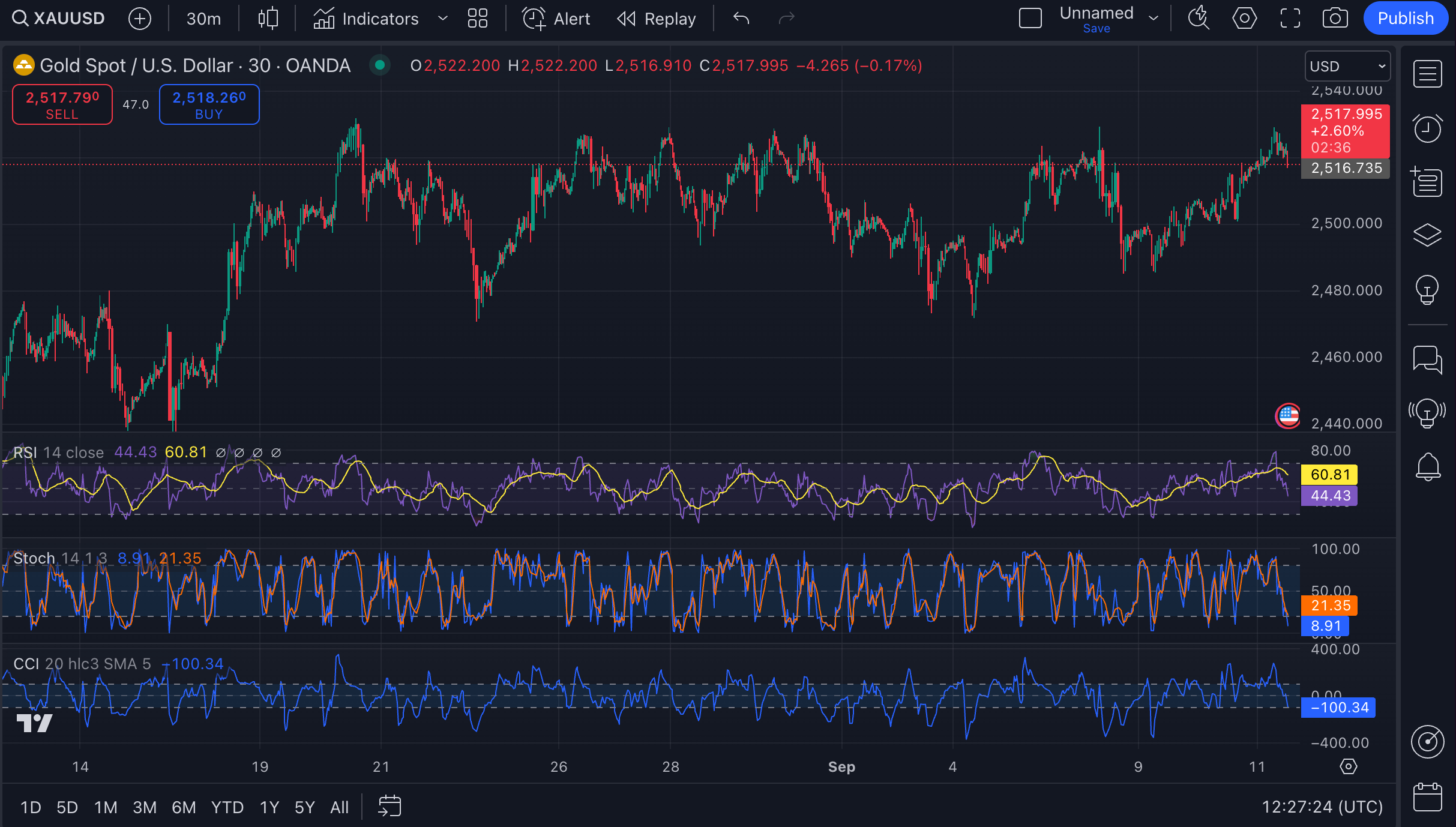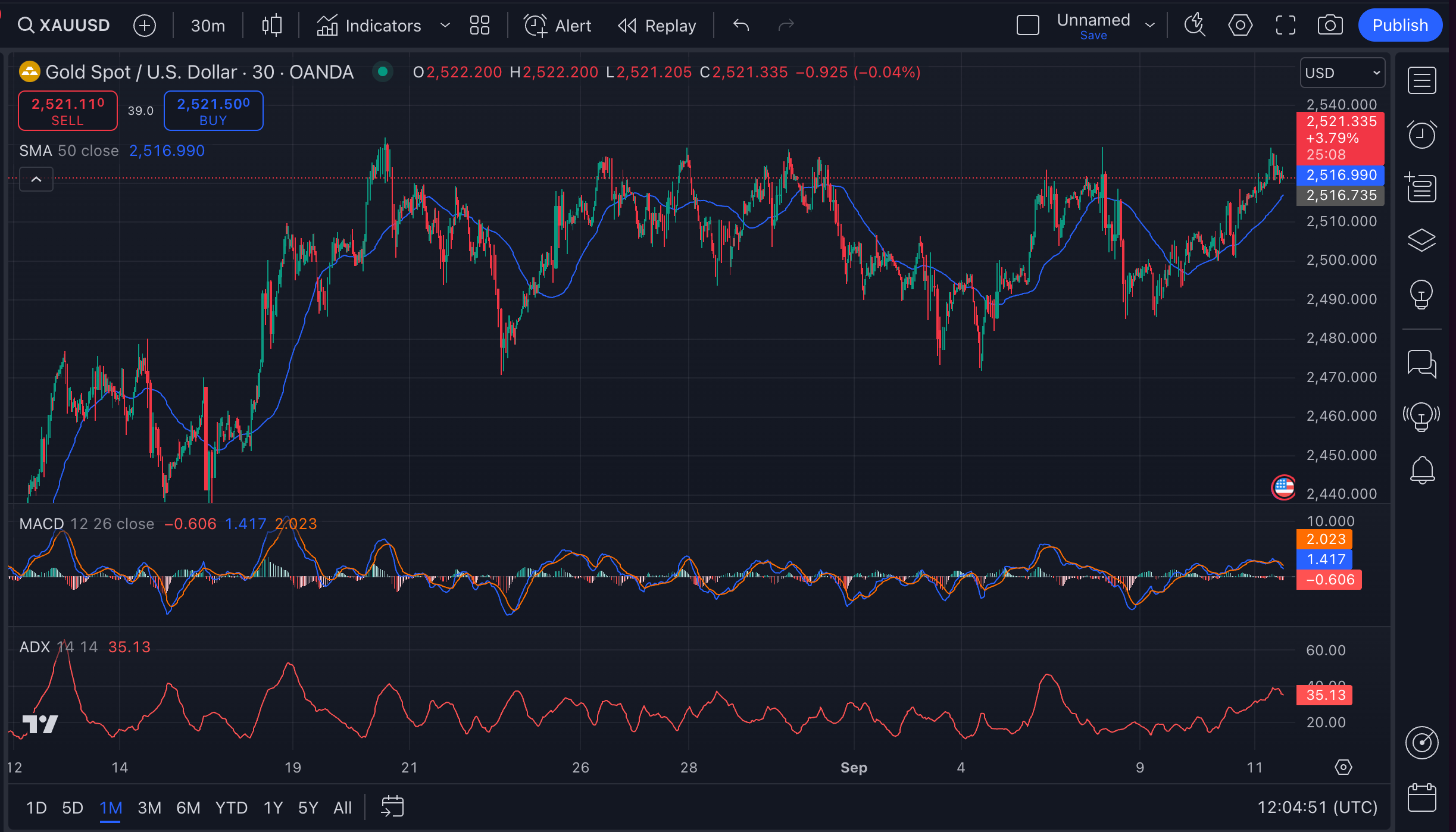 The SMA (50) is at $2,516.99. The price is currently hovering just above this line, which means the market is at a decision point. If the price holds above the SMA, this could support further bullish momentum. If it drops below, we might see another retest of $2,500 support level.