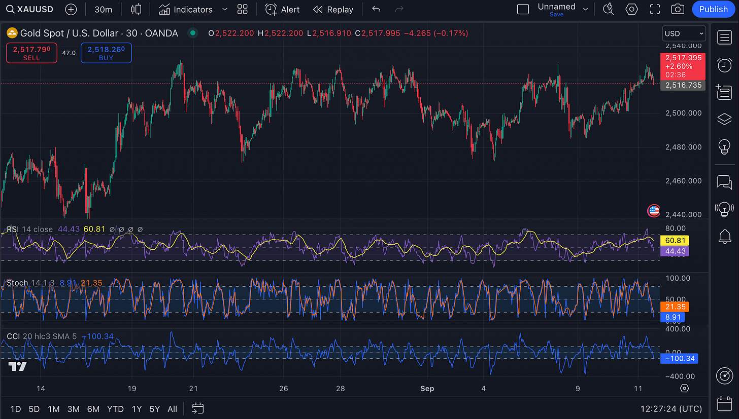 Right now, the Bollinger Bands are inside the Keltner Channels, which is a signal of consolidation - The upper KC band is $2,529.161, and the lower KC band is at $2,511.578. This condition typically suggests that a larger move in price may be coming soon (either up or down).