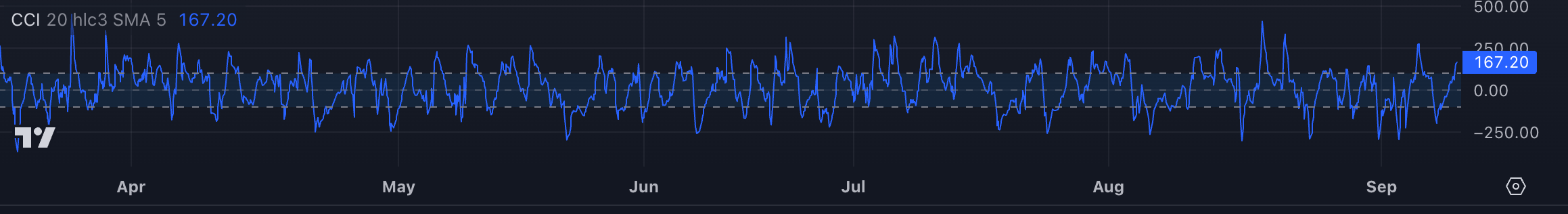 CCI above +100 indicates overbought conditions (potential sell signal). CCI below -100 indicates oversold conditions (potential buy signal).